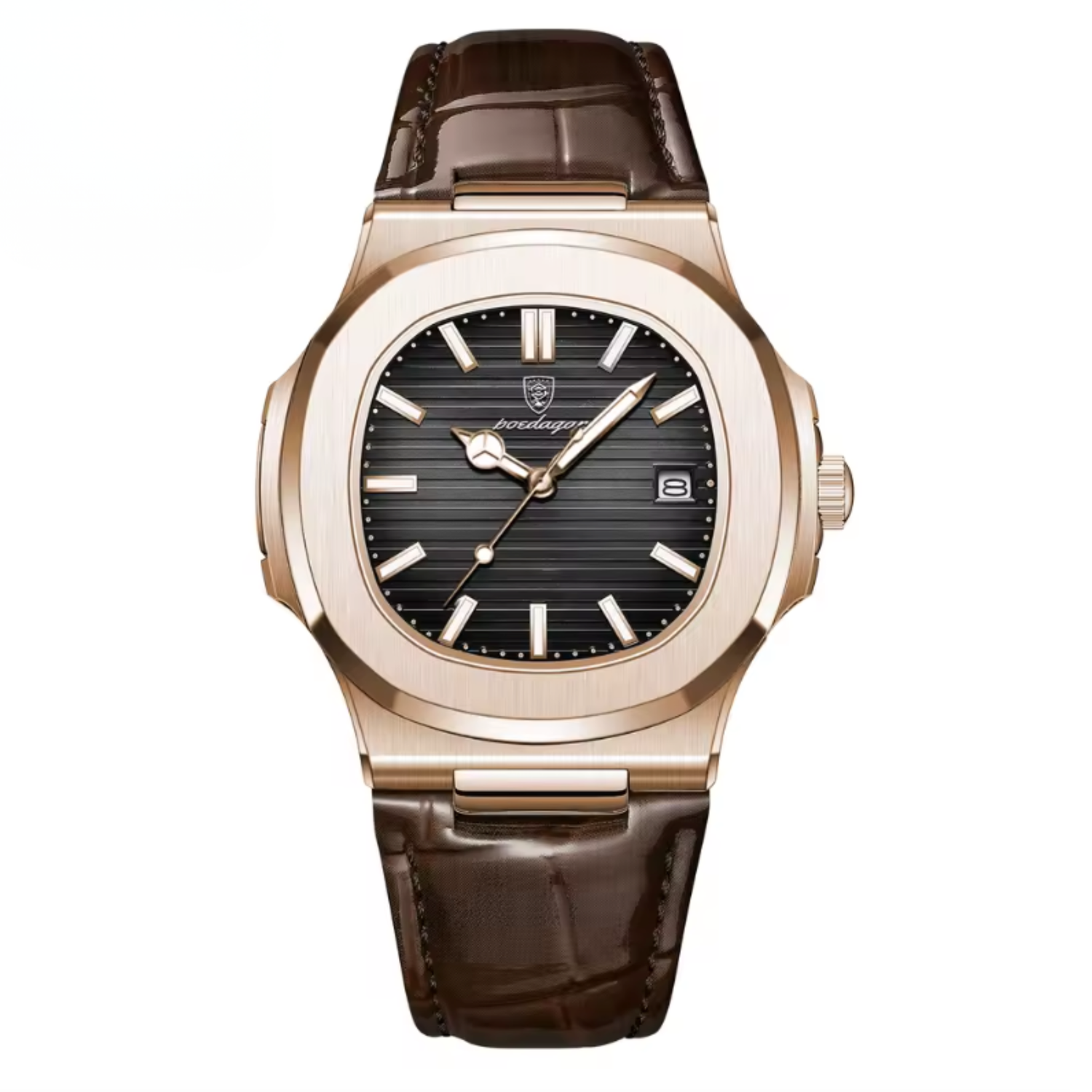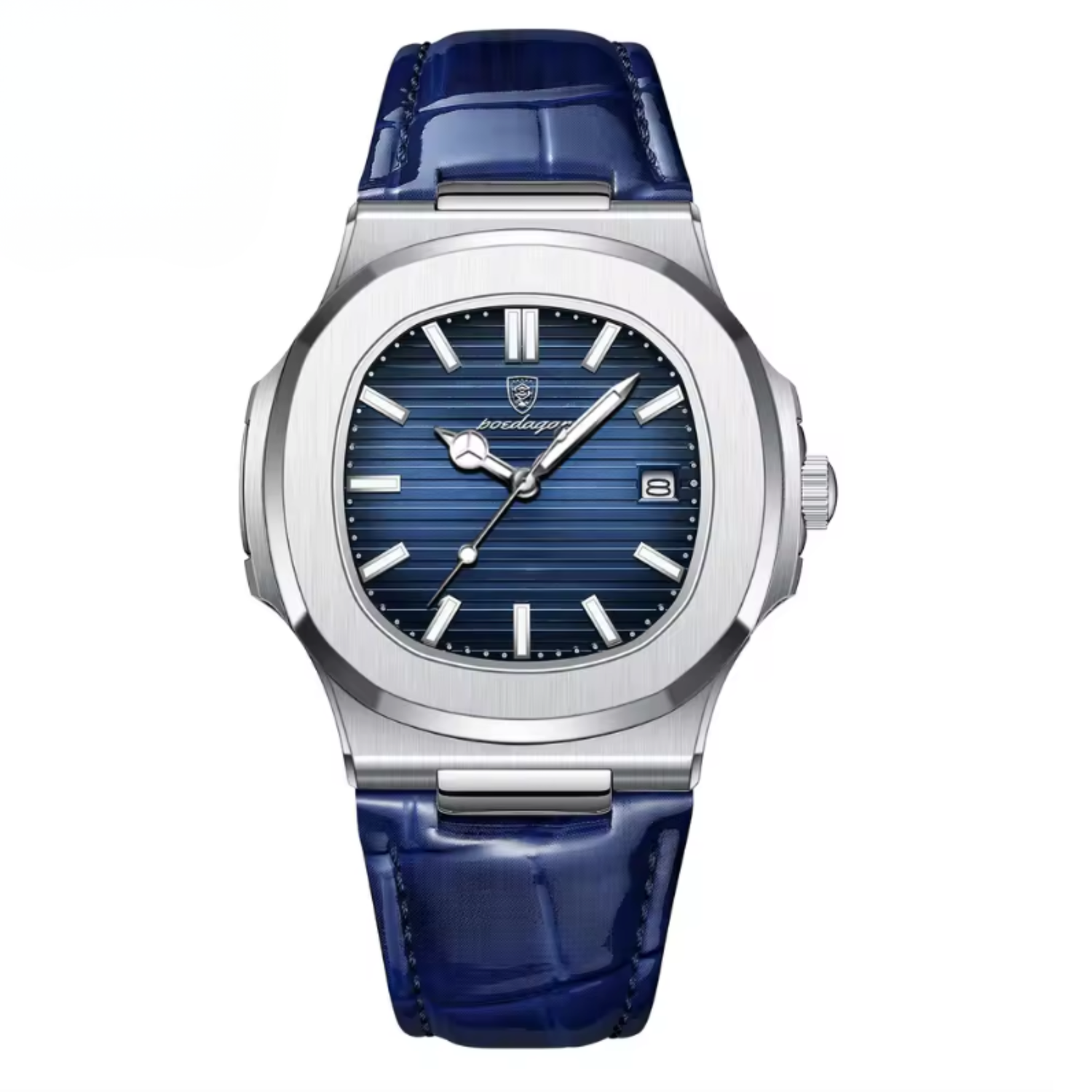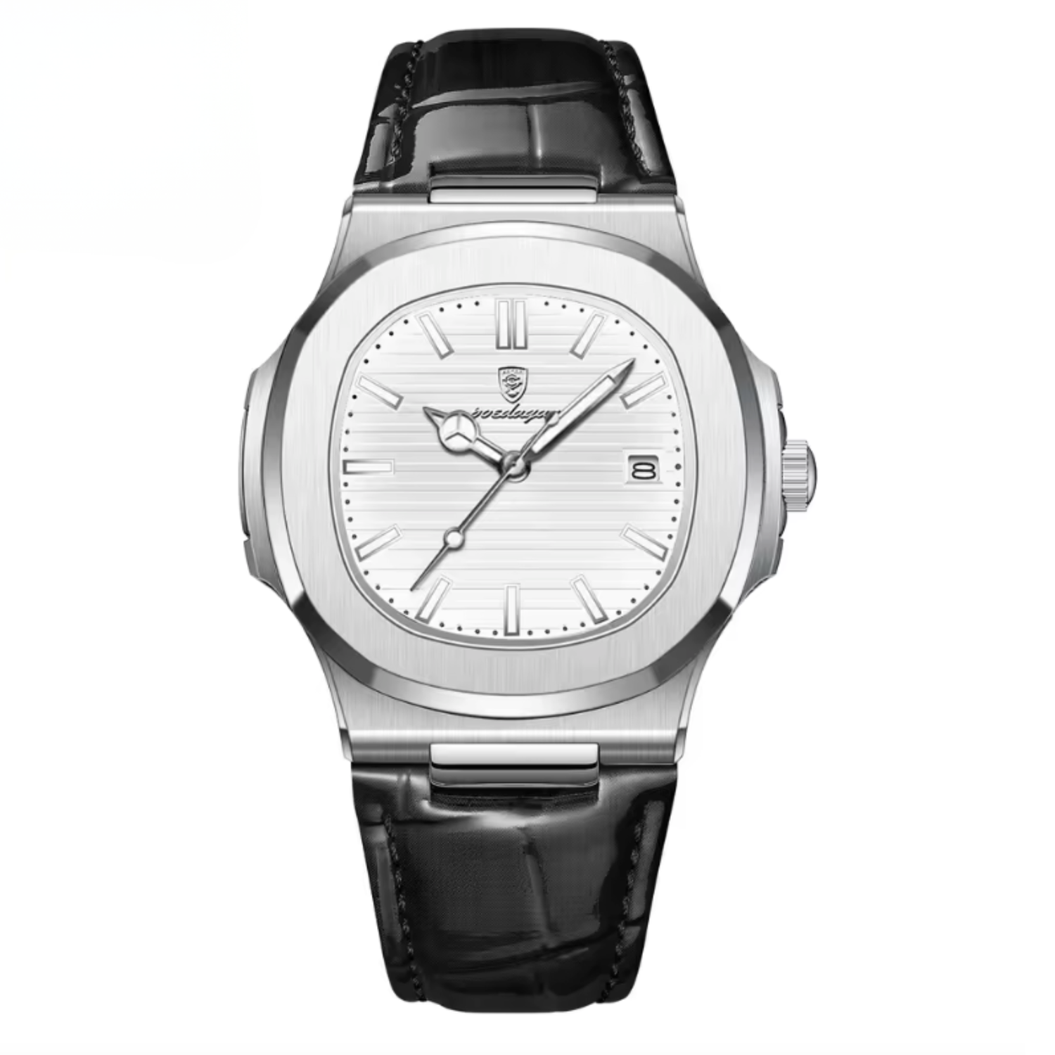 The MARCELLI™ embodies the language of modern luxury — refined, assertive, and timeless. Its sculpted case merges brushed steel and soft curvature, while the alligator-embossed leather strap adds depth and texture. Every reflection of light across its polished surface tells a story of control and quiet confidence.