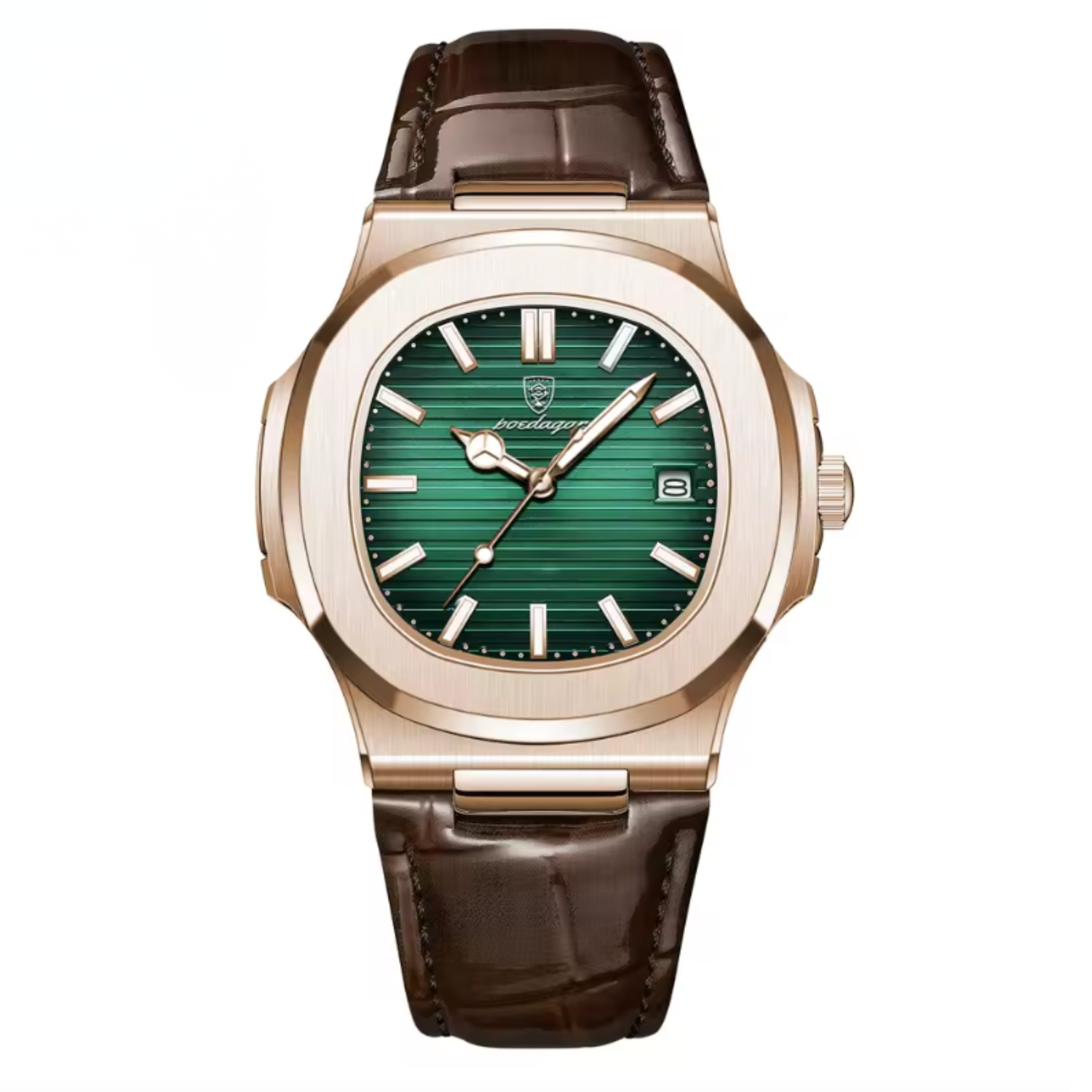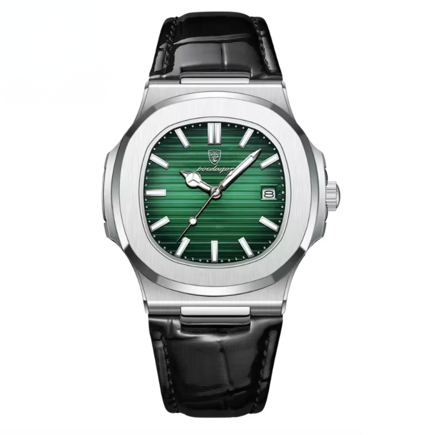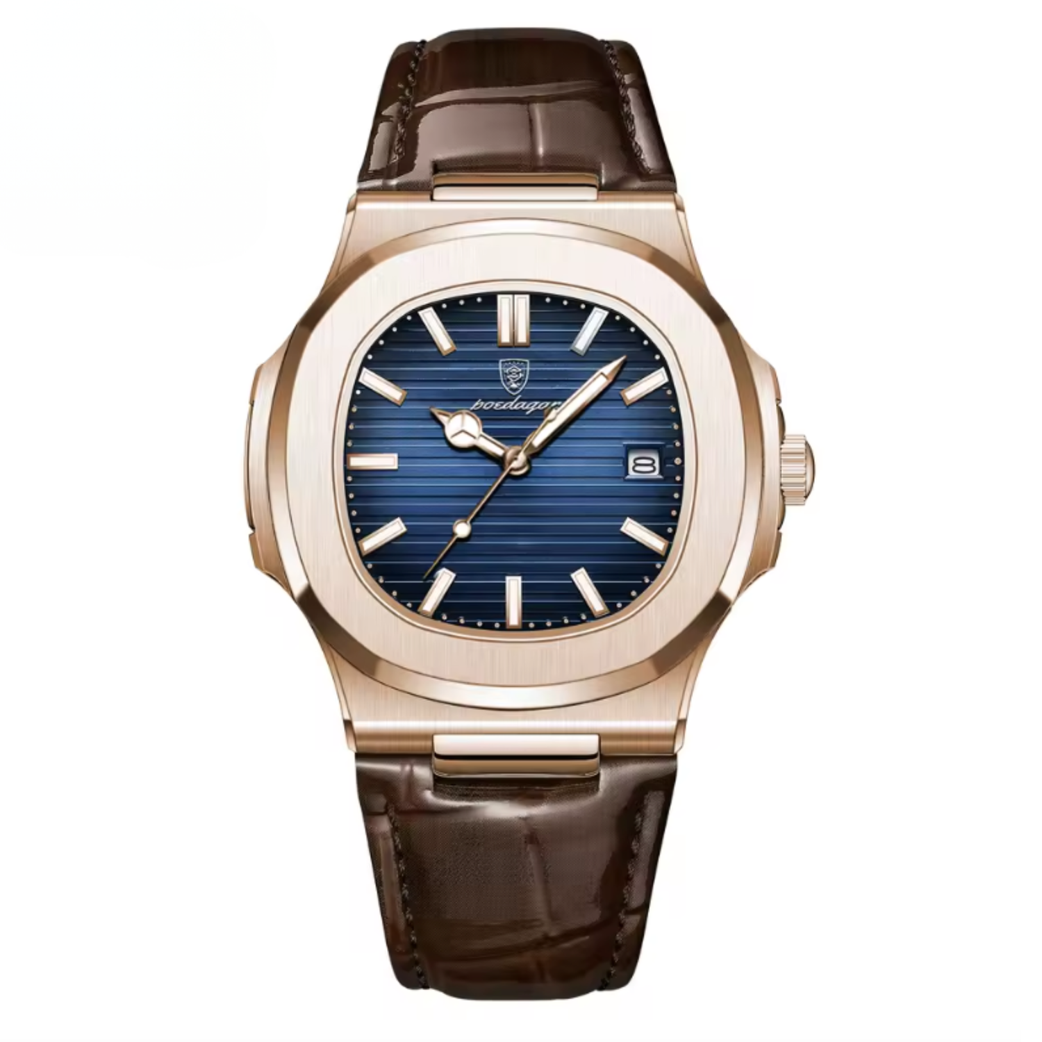 The MARCELLI™ embodies the language of modern luxury — refined, assertive, and timeless. Its sculpted case merges brushed steel and soft curvature, while the alligator-embossed leather strap adds depth and texture. Every reflection of light across its polished surface tells a story of control and quiet confidence.