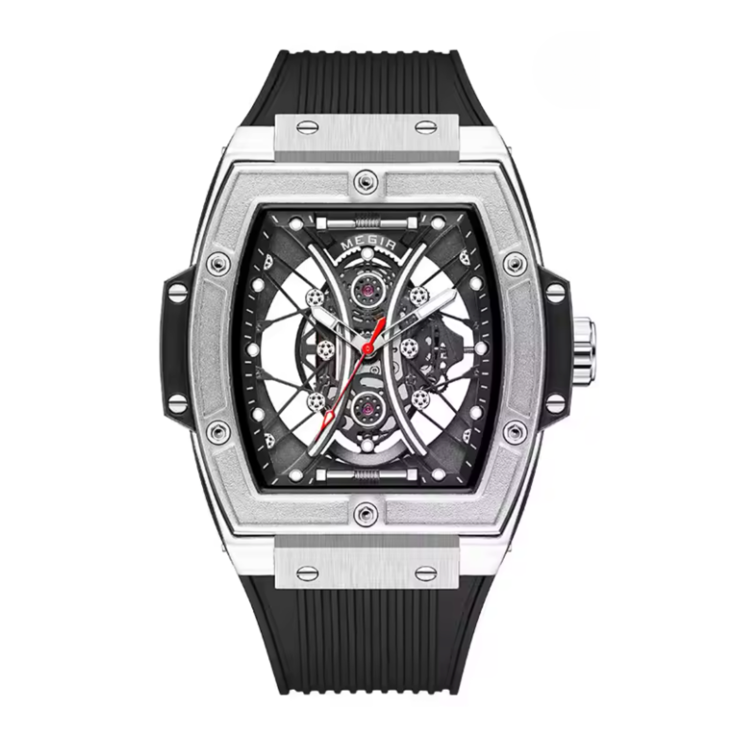 The THAROS™ embodies the essence of mechanical strength and avant-garde design — a sculpted fusion of architecture and energy. Its tonneau-shaped case, anchored by visible screws, frames an openworked dial revealing the symphony of its movement: gears, balance, and precision in pure harmony.